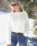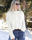 This incredibly soft and cozy style features a cable knit pattern throughout the body. Details include ribbed crewneck and cuffs, with single stitch finish at the hem. The perfect crop top for an easy everyday seasonal look!