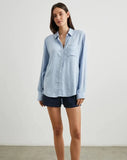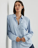 The Hunter Shirt is our signature button-down shirt that works for day, night, and even better, the weekend. Its unique fabric is spun from an incredibly soft rayon that hangs beautifully without any effort. This particular style features a light blue heather print. Perfectly relaxed with a classic fit, it can be tucked, tied, or left open.