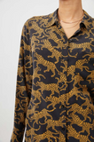 This classic design features a playful, stylish animal print mixed with a luxe, elevated fabrication to create a timelessly polished look. Made from washed silk, this button-down tailored top features a single front pocket.