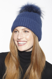 Cashmere and wool ribbed fur pom beanie in Navy.