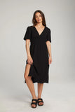 Elevate your style with ease in the Palmer Midi Dress is licorice. With its sexy neckline, smocked detailing at the bodice, and subtle side slits, this midi is perfection.