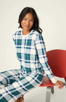 crafted from cloud-soft thermal velour in classic blue-and-green checks on an ivory backdrop. With its relaxed crew top