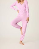 This pink jammie top brings romantic charm to your evening routine. With a satin rose accent on the waistband and a flattering v-neck long sleeve top, this duo makes relaxing feel like a love-filled affair.