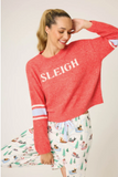 Sleigh all day in this festive pullover. Crafted in a cozy, fuzzy knit with an easy, relaxed fit, it’s designed with bold varsity-striped sleeves and a cheeky holiday graphic across the front. The perfect piece to pull on for tree-trimming, gift-wrapping, or curling up fireside with a seasonal sip in hand.