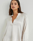 A classic blouse with elevated details, the Wynna is sure to be a go-to in your repertoire. Made from satin back crepe, it moves and shines with you. Complete with long sleeves, a v-neckline, and ruching at the sleeves and back.